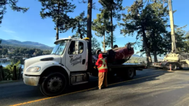 In a dramatic incident in Ladysmith, British Columbia, a car veered off a cliff and landed upside down on the deck of a cabin, necessitating the use of a crane for its removal. The event, which occurred recently, caused substantial damage to the cabin structure, highlighting the dangers of roadside accidents in the area.