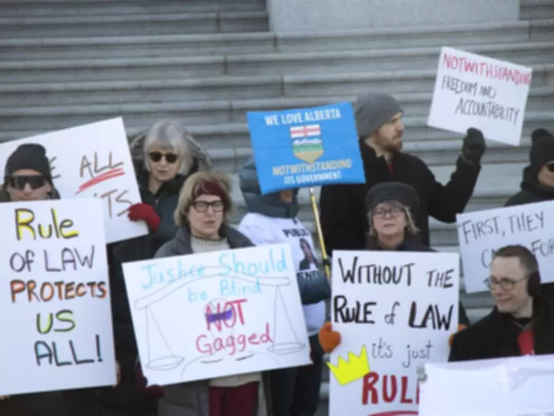 Approximately 100 lawyers and justice system participants assembled on the steps of the Alberta legislature on Tuesday, March 10, 2026, to voice strong opposition to what they characterize as systematic attacks on the rule of law by the United Conservative Party government. The protest, organized by the Edmonton Criminal Trial Lawyers' Association, featured demonstrators carrying placards with messages such as "respect judicial independence" and "hands off our courts."