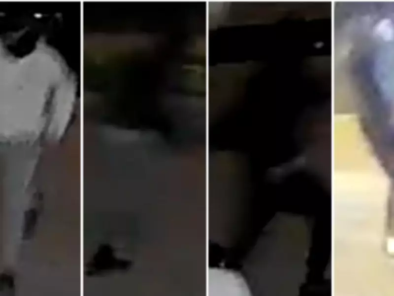 The suspects, all wearing face masks, fled in a 2016-2021 black Honda Civic sedan. Suspect 1 is described as a thin male in a white sweater and grey pants. Suspect 2 is a thin male in a black sweater and grey pants. Suspect 3 is a thin male in a black sweater and grey pants. Suspect 4 is a thin male in all black clothing.
